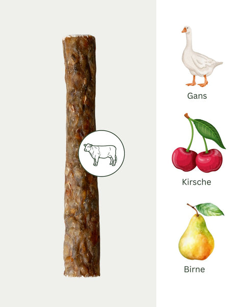 Unser Wildgenuss-Riegel sorgt für genussvolle Kau-Momente – außen hochwertige Rinderhaut, innen eine unwiderstehliche Füllung aus zarter Gans, fruchtiger Birne und aromatischer Kirsche. Ein Geschmackserlebnis, dem kaum eine Fellnase widerstehen kann! Ideal zum Verwöhnen, Beschäftigen und Genießen – natürlich ohne künstliche Zusätze.