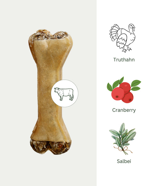 Ob als besondere Belohnung oder einfach als natürlicher Kausnack zwischendurch: Unser Truthahn-Cranberry Knochen sorgt für ausgiebigen Kauspaß und unterstützt zugleich die Zahnpflege Deines Vierbeiners.